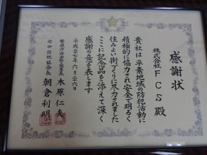 感謝状を受領いたしました 2015/06/26 2015年6月26日 府中警察署と府中防犯協会から感謝状を受領いたしました。 地域の防犯活動に積極的に協力し、安全で明るい街づくりに尽力したことに対して感謝状が贈られました。